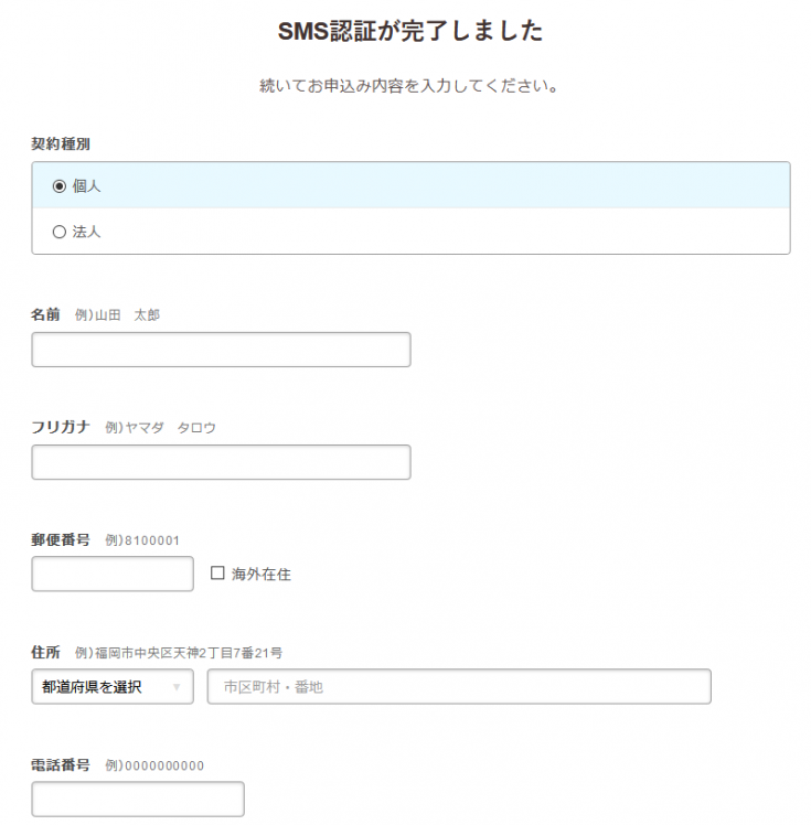 ⑦認証完了後、申込み内容(個人の場合:名前・フリガナ・郵便番号・住所・電話番号)の入力を行う。