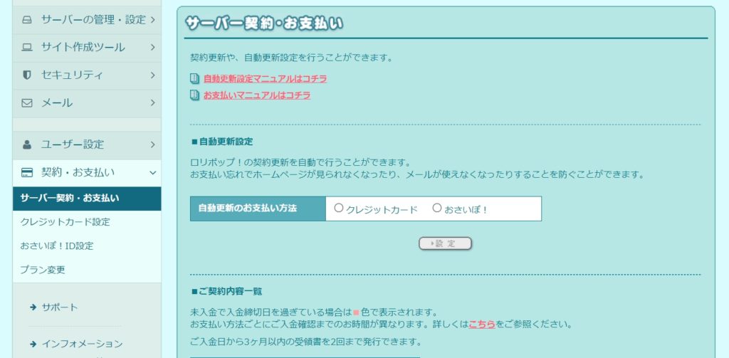 ⑫次に、画面左にあるメニュー「サーバー契約・お支払い」内にある「自動更新のお支払い方法」で「クレジットカード」を選択する。