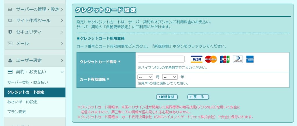 ⑪画面左にあるメニュー「クレジットカード設定」の画面で、「クレジットカード番号」と「カード有効期限」を入力後、「新規登録」をクリックする。