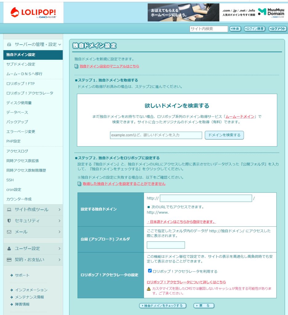 ③独自ドメインが決定したら、ロリポップ!の管理画面へ移動する。
